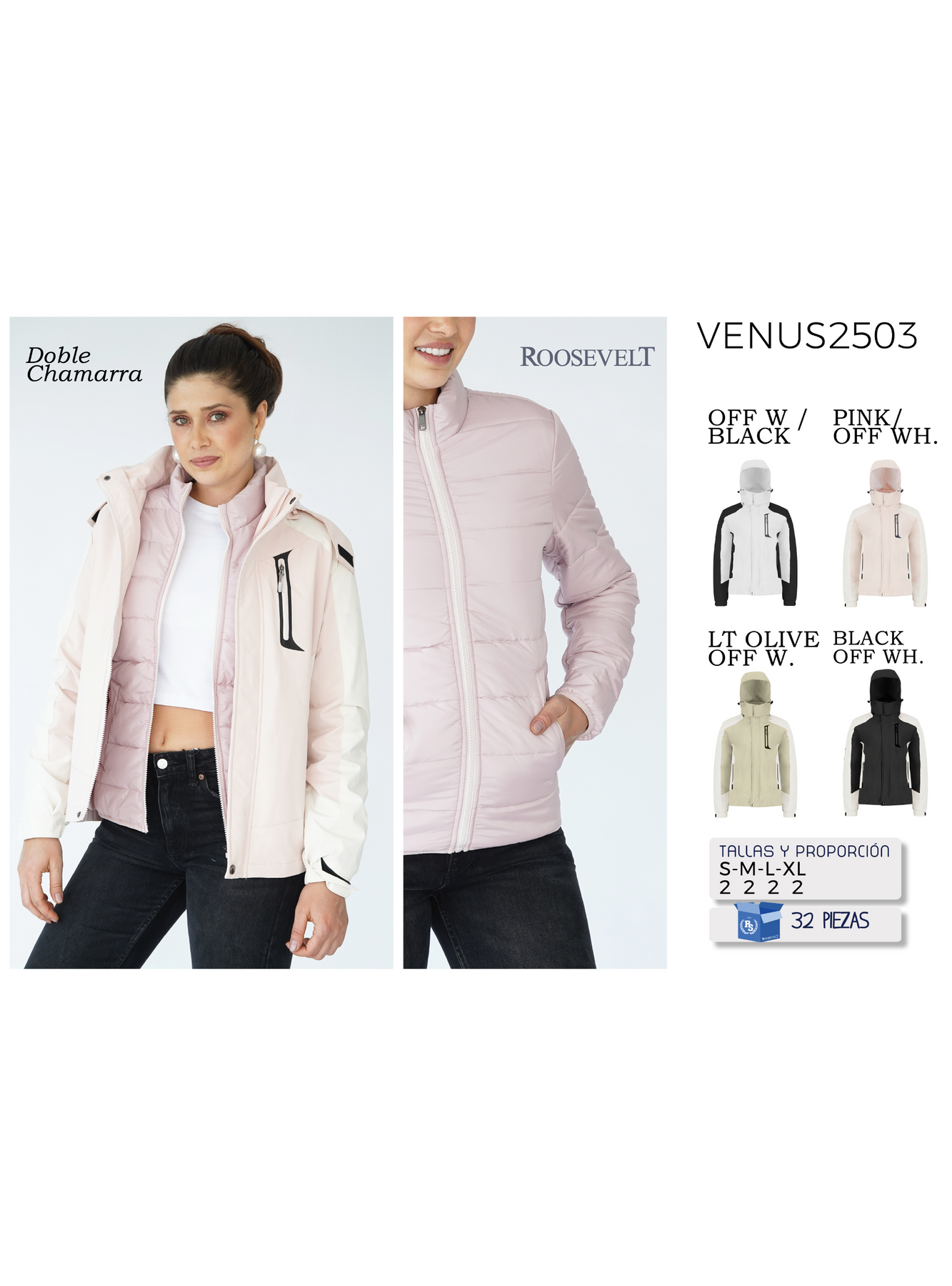 Chamarra VENUS-2503 Si, es doble es correcto. 2 chamarras en 1  Renueva tu guardarropa con esta chamarra acolchada Y   ideal para el frío! Con su diseño moderno y confortable, te ofrece una protección superior contra las bajas temperaturas. Presenta un cierre frontal completo y bolsillos laterales con cierre. Perfecta para combinar con cualquier atuendo.