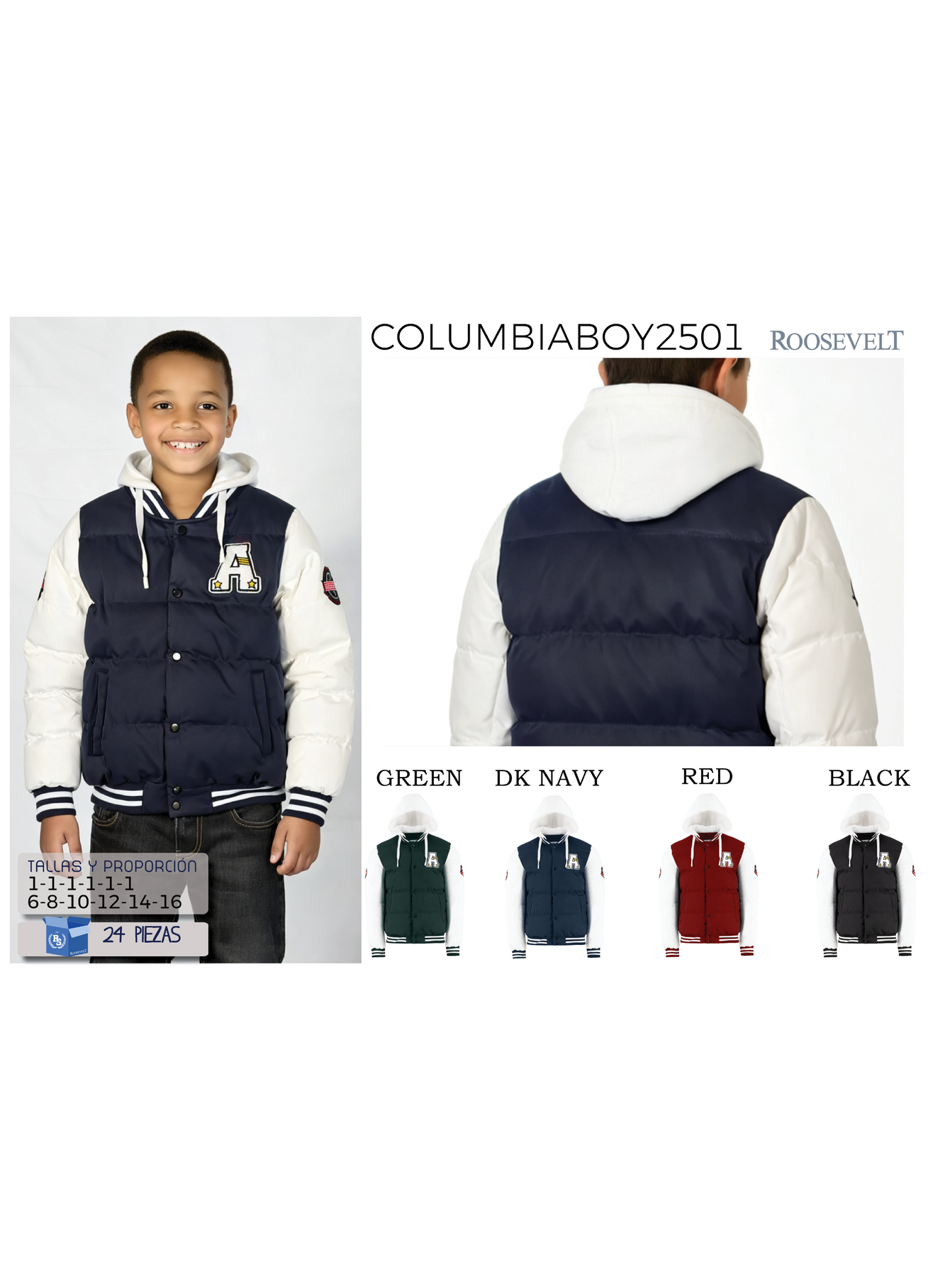 Chamarra COLUMBIABOY-XT2501 para niño. Cuenta con capucha ideal para el frío, perfecta para mantenerte abrigado y a la moda en cualquier ocasión.