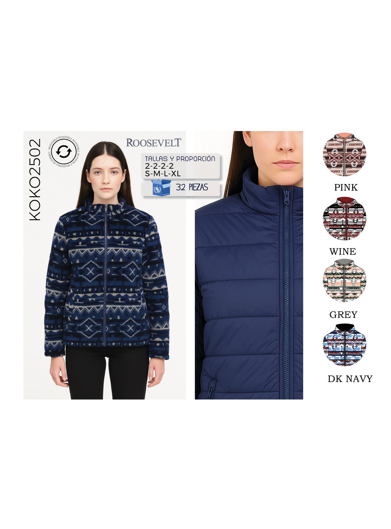 - Colores: DK Navy, Pink, Wine, Grey.